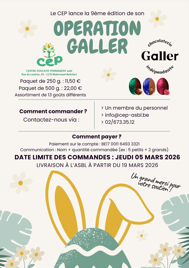 Pour passer commande, contactez-nous à info@cep-asbl.be ou au 02/673 35 12 (les commandes sont à retirer sur place). N’oubliez pas que la date limite pour commander est le 5 mars, avec une livraison prévue à partir du vendredi 19 mars 2026. Pour le paiement, utilisez le compte BE17 0011 6493 3321 (CEP) en indiquant votre nom et la quantité commandée (par exemple : 5 petits et 2 grands).